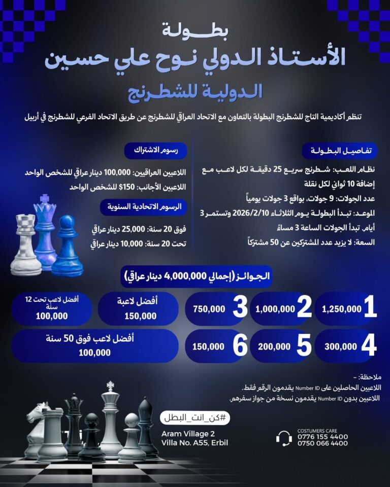 News Home About Us Founder’s Message Our Team Our Classes Clubs Classroom FIDE Registration News Media Center Photo Gallery Tournaments Iraq Federation Tournaments International Tournaments Contact Us Live Matches Home About Us Founder’s Message Our Team Our Classes Clubs Classroom FIDE Registration News Media Center Photo Gallery Tournaments Iraq Federation Tournaments International Tournaments Contact Us Live Matches Facebook Page News Latest News from Our Facebook Page